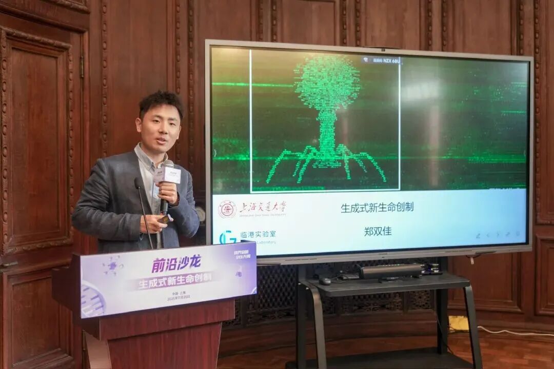 郑双佳在主持发言环节首先抛出核心议题:“生成式 AI 何以成为生命创制的关键起点?” 自 2022 年起,生成式人工智能不仅重构了语言与视觉领域的发展逻辑,更深刻改变了生物设计的底层思路,“如今,生成式 AI 已具备理解并改写 DNA 语言的能力”,他以斯坦福大学团队借助 Evo 模型设计出耐药性更强的噬菌体基因组为例,指出 AI 正逐步从 “分子生成” 向 “生命生成” 跨越,真正成为生命创制的重要起点。