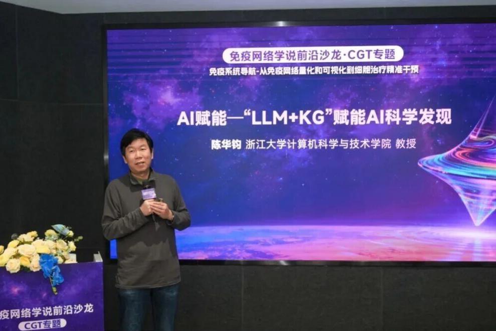 在 AI for Science 赋能 CGT 产业发展的专题环节,浙江大学陈华钧教授从人工智能技术应用的角度,分享了大模型、知识图谱在生物医药领域的研究进展与实践应用成果。陈华钧指出,大模型在知识处理、泛化能力等方面具备显著技术优势,但同时存在生成内容幻觉、精准度不足等技术短板,而知识图谱的技术特性能够有效弥补这一不足,二者的深度融合已成为驱动 AI for Science 发展的核心方向。其团队将知识图谱与大模型进行技术融合创新,在分子设计、蛋白质定向进化等生物医药核心领域取得了一系列重要研究进展,并成功搭建科学领域的知识图谱平台,为免疫学等前沿学科的研究工作提供了坚实的人工智能技术支撑。陈华钧还提出,可针对免疫学领域构建个性化 AI 智能体(Claw),将免疫研究相关的工具、数据、模型进行技能化整合,实现人工智能技术与免疫学家的人机共生,为免疫网络学说的深入研究与 CGT 技术的创新开发提供助力。